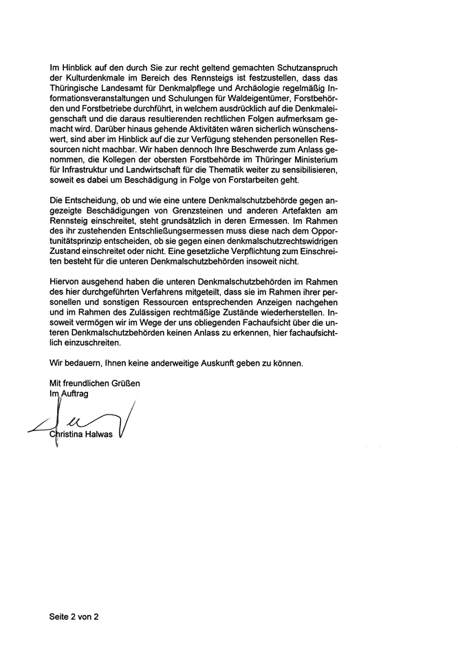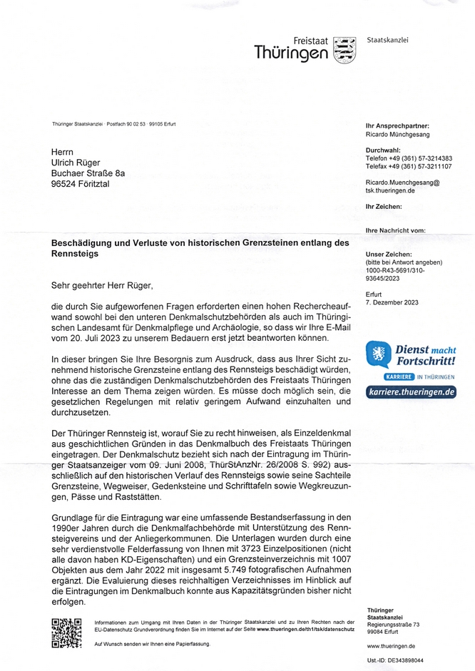 ich habe Mitte Dezember Ihr Antwortschreiben auf mein Anliegen bezüglich der Beschädigung von denkmalgeschützten Grenzsteinen am Rennsteig erhalten.