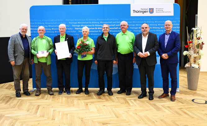 von links nach rechts: Dr. Sven Ostritz (Präsident TLDA), Ulrich Rüger (Hauptwegewart Rennsteigverein), Ernst Haberland (stellv. Fürsteher Rennsteigverein, Vorsitzender der OG Suhl), Sylvia Rüger (Rennsteigverein), Prof. Dr. Harald Töpfer (Fürsteher Rennsteigverein), Willi Lehmann (Rennsteigverein), Prof. Dr. Steffen Teichert (Staatssekretär für Wissenschaft und Kultur), Jörg Klinge (Sparkassen-Kulturstiftung Hessen-Thüringen)