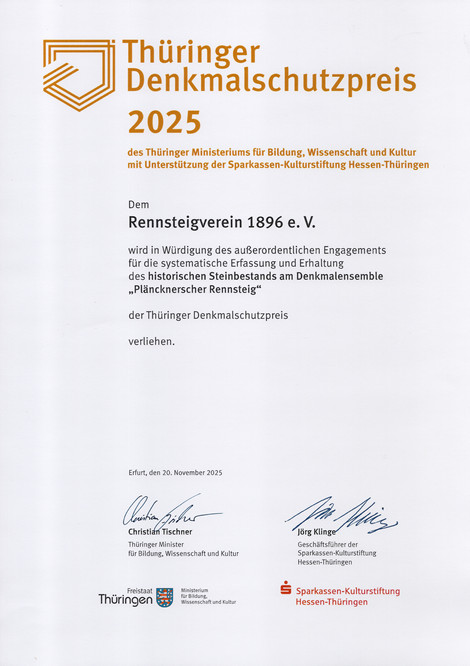 Der Rennsteigverein 1896 e.V. erhält den Thüringer Denkmalschutzpreis 2025