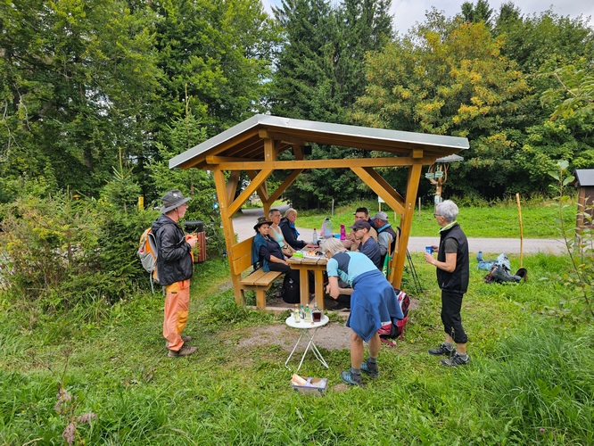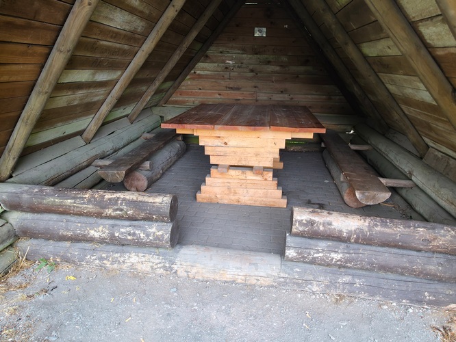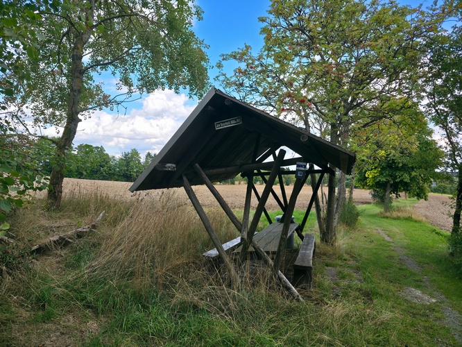 Gleich im Anschluss an den Flurort "Hoher Bruch" treffen wir auf das Kneipp Becken mit einer kleinen Schutzhütte, einer Quelle und einem Rastplatz. Während die Gesamtkonstruktion der Sitzgruppe einen ordentlichen Eindruck hinterlässt, wäre es notwendig, die Tischplatte zu erneuern. In diesem Zuge könnte der Rastplatz mit einem neuen Schutzanstrich vesehen werden.