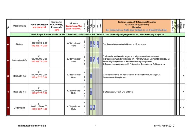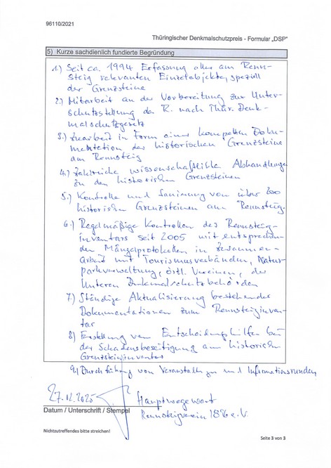 Im letzten Jahr beschwerde ich mich im Namen unseres Vereins beim Thüringer Denkmalrart und bei der damals noch zuständigen Staatskanzlei. Nach einer langen Wartezeit auf eine Antwort, wurde mir schließlich mitgeteilt, dass ein Faltblatt, speziell für die Forstdienstleister erarbeitet werden sollte, um die Forstarbeiter vor Ort auf die historische Bedeutung der Grenzsteine hinzuweisen. Nachdem ich über ein halbes Jahr vergeblich auf eine Antwort wartete, entschlossen sich meine Ehefrau und ich in Absprache mit unserem Verein, selbst einen Vorschlag für ein Faltblatt zu erarbeiten, welches ich Ihnen in der Anlage zusenden möchte. Im Übrigen soll das Faltblatt ohne Nennung von Gründen zwischenzeitlich nicht mehr erstellt werden und durch eine Broschüre ersetzt werden, die in ihrer Form und Aussage als Handreichung für die in Leistung arbeitenden Forstdienstleister völlig ungeeignet ist.
