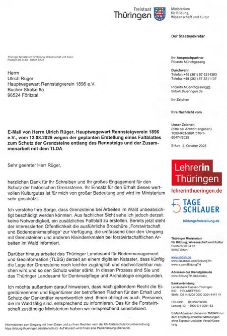 Schreiben von Staatssekretär Prof. Dr. Steffen Teichert zum Denkmalschutz am Rennsteig