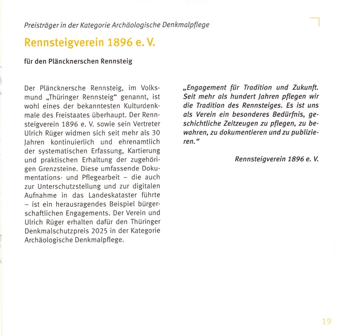 Im Vorjahr unseres 130-jährigen Vereinsjubiläums ist dieser Preis eine Würdigung der bisher geleisteten Arbeit auf dem Gebiet des Denkmalschutzes, die sich eigentlich durch die gesamte Vereinsgeschichte wie ein roter Faden zieht. Das wollen wir beibehalten und weiter ausbauen, um das Geschichtsbewusstsein der eigenen Mitglieder aber auch das derjenigen, die sich für den Rennsteig begeistern, zu fördern. Dass wir auf dem richtigen Weg sind, zeigt die Resonanz auf unsere Arbeit. Darauf können wir stolz sein.